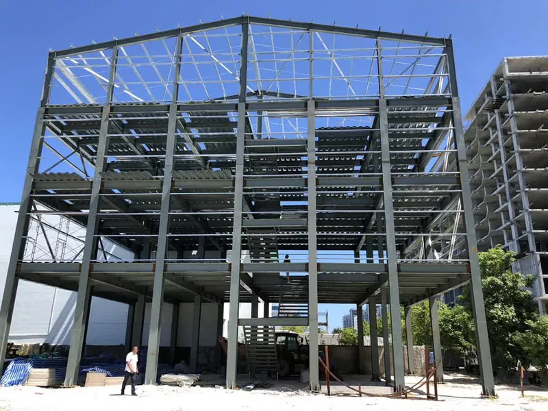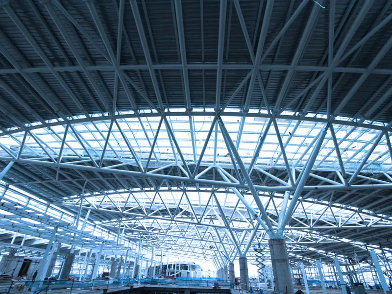 5. التسقيف والكسوة الخارجية بمجرد اكتمال الإطار الفولاذي، يتم تركيب نظام التسقيف، عادةً باستخدام ألواح معدنية معزولة أو مواد غشائية أحادية الطبقة. يتم أيضًا تركيب الجدران الخارجية، إذا كانت متضمنة في التصميم، باستخدام الألواح المعدنية أو الطوب أو مواد الكسوة الأخرى.